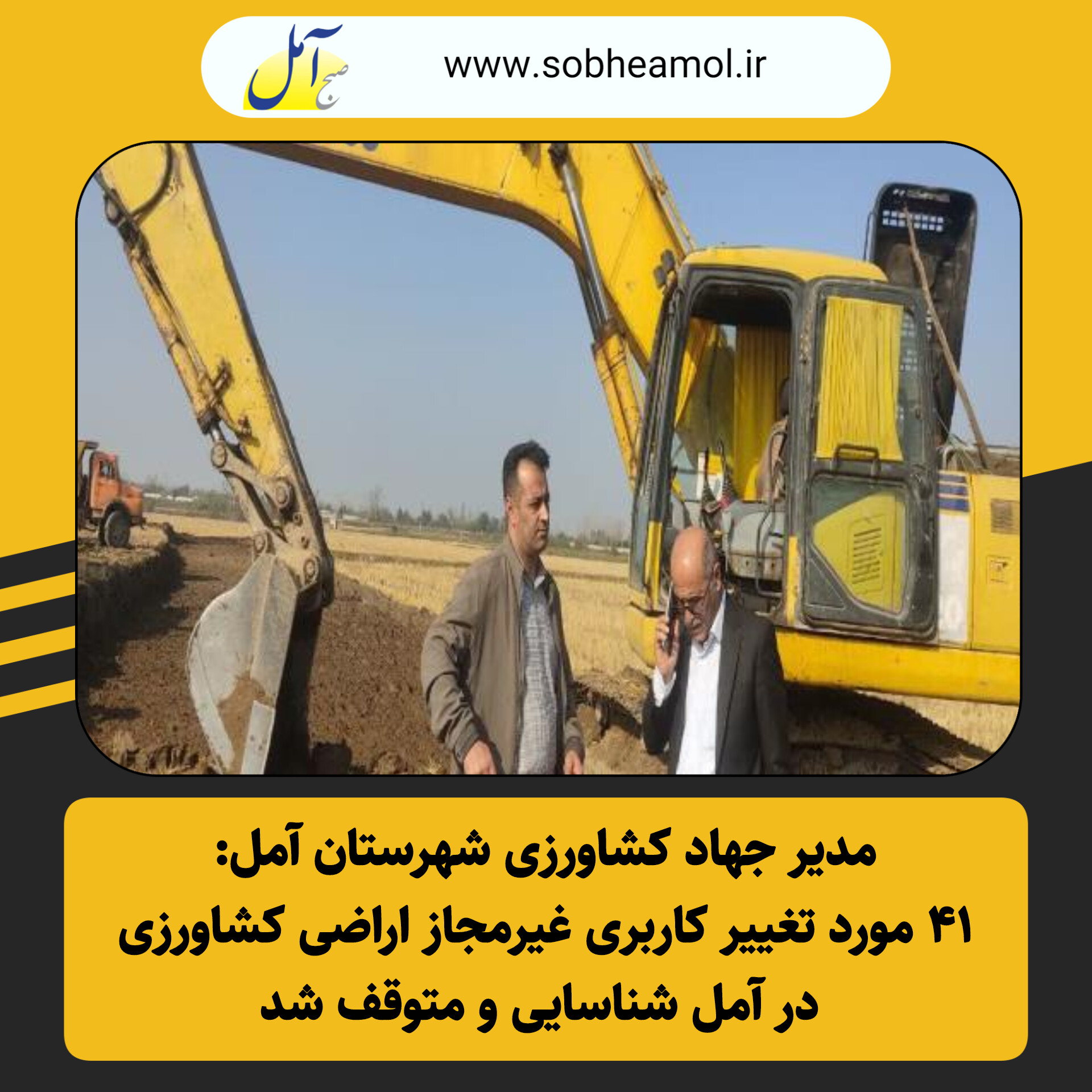 مدیر جهاد کشاورزی شهرستان آمل، از شناسایی و توقف عملیات ۴۱ مورد تغییر کاربری غیرمجاز در اراضی کشاورزی این شهرستان در ماه آذر ۱۴۰۴ خبر