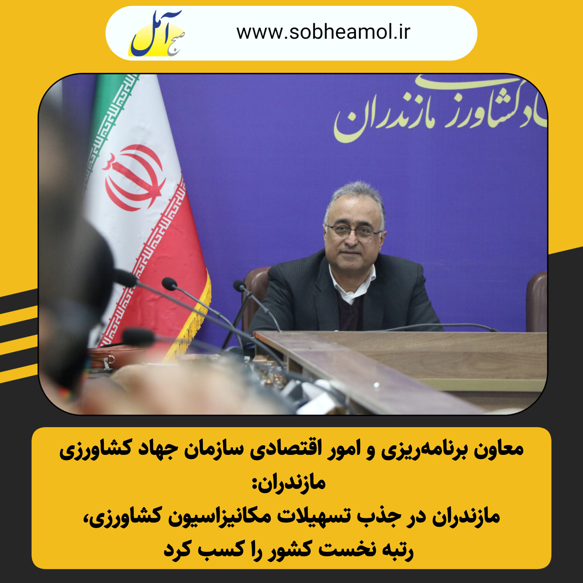 در سی و هفتمین جلسه کارگروه اقتصادی و توسعه سرمایه‌گذاری استان مازندران، معاون برنامه‌ریزی و امور اقتصادی سازمان جهاد کشاورزی اعلام کرد: این استان با جذب ۹۵.۵ درصد از اعتبارات خط مکانیزاسیون و پرداخت بیش از ۴۲۵۱ میلیارد ریال تسهیلات به بیش از هزار متقاضی، موفق به کسب رتبه اول کشور در این حوزه شد.