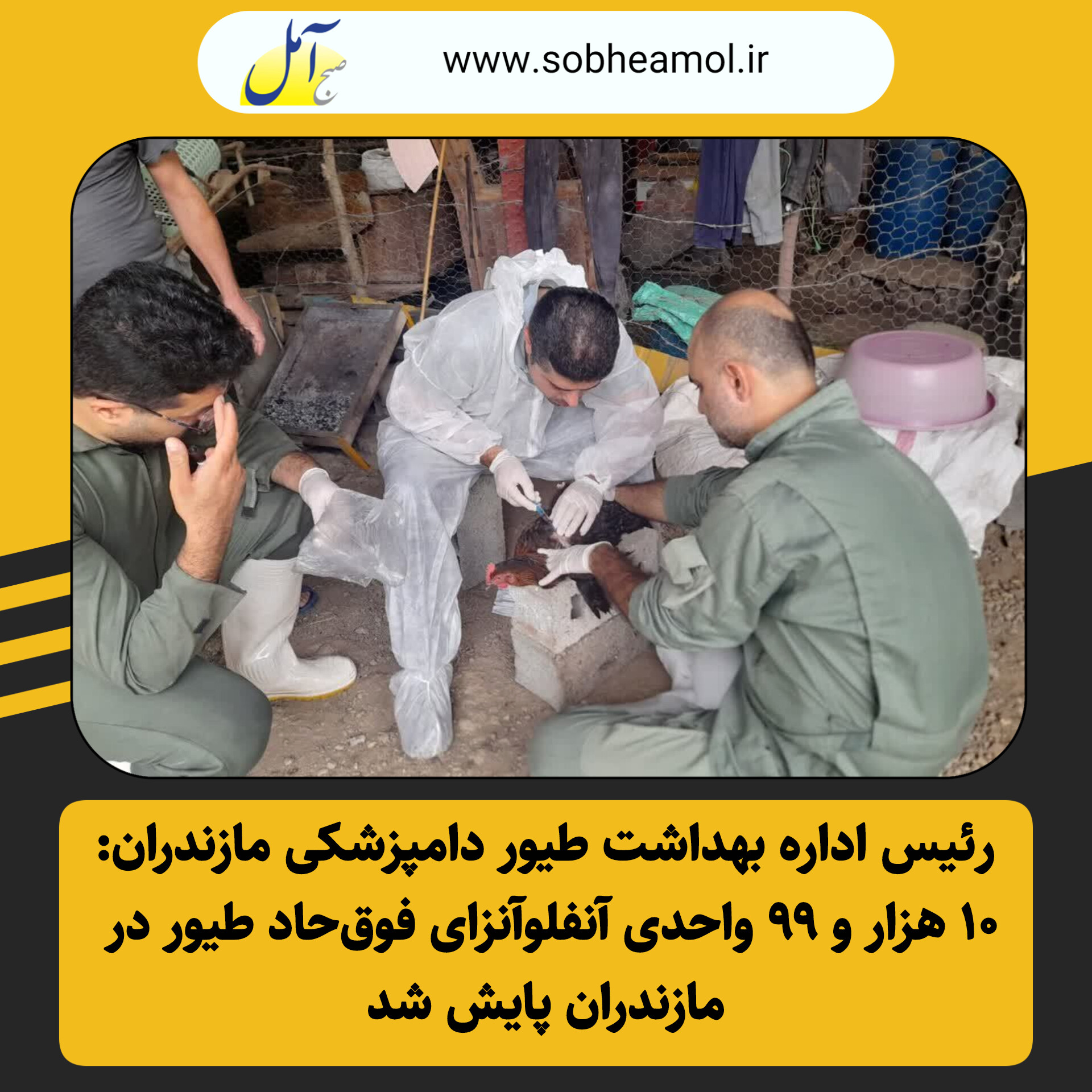 رئیس اداره بهداشت طیور دامپزشکی مازندران از انجام بیش از ۱۰ هزار مورد پایش بیماری آنفلوآنزای فوقحاد طیور در مراکز پرورش استان خبر داد.حمید شجاعی