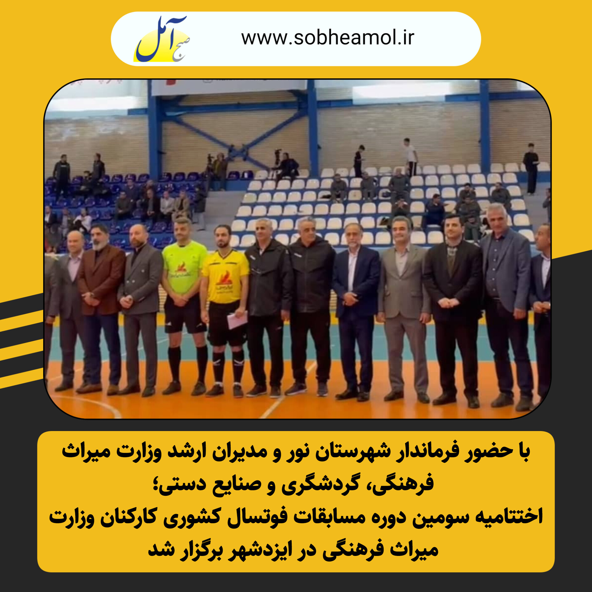 آیین اختتامیه سومین دوره مسابقات فوتسال کشوری کارکنان وزارت میراث فرهنگی، گردشگری و صنایعدستی با حضور “تورج آتشفراز” فرماندار شهرستان نور، مدیرکل رفاه وزارت میراث فرهنگی و جمعی از مدیران و مسئولان کشوری و استانی در ایزدشهر برگزار شد.